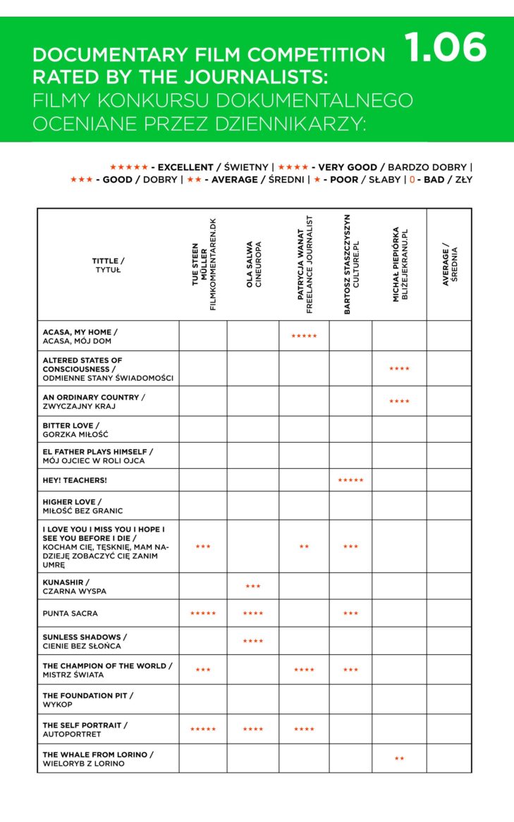 As every year we have asked journalists and bloggers to rate films from the Documentary Competition. During the 60th KFF, stars will be awarded by Tue Steen Müller (filmkommentaren.dk), Ola Salwa (Cineuropa), Patrycja Wanat (freelancer), Bartosz Staszczyszyn (Culture.pl) and Michał Piepiórka (Blizej Ekranu).